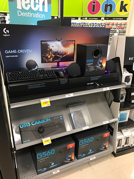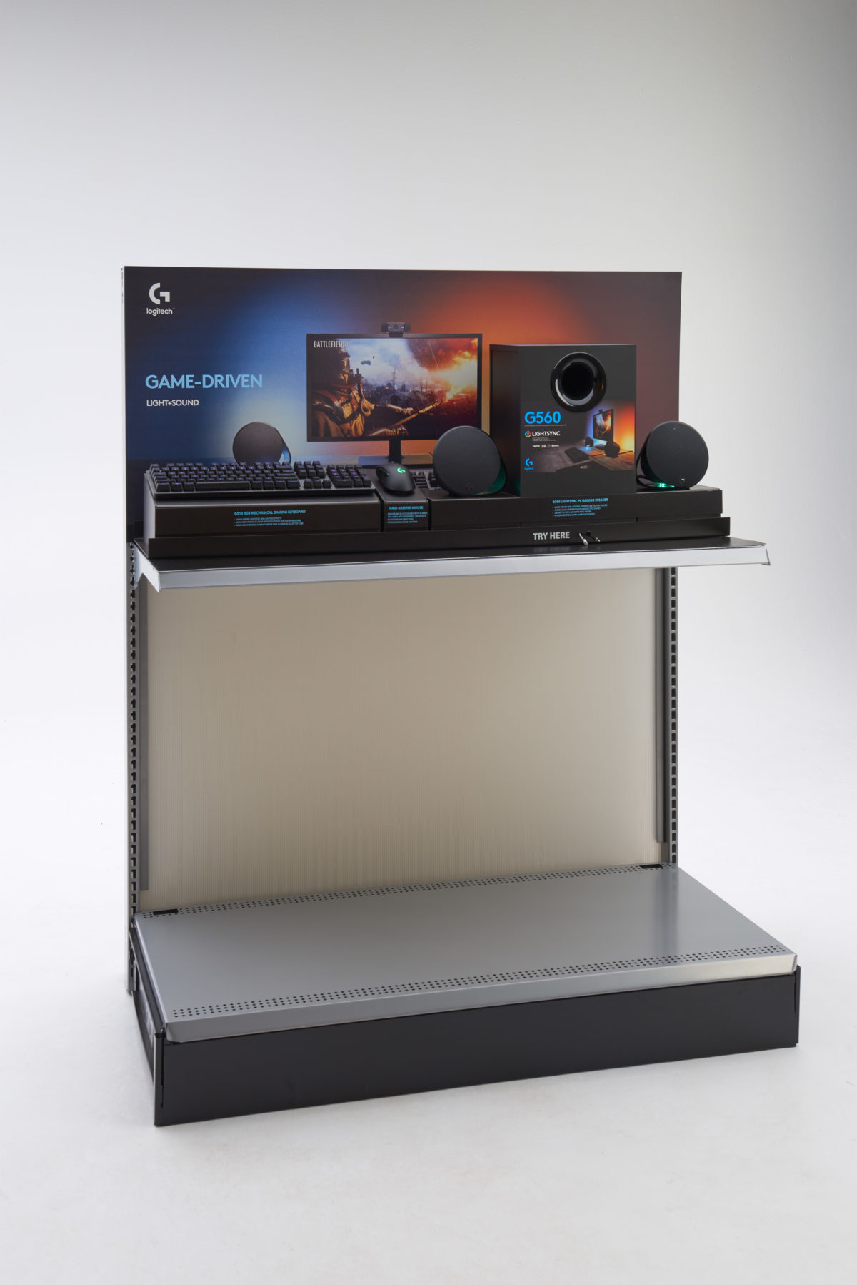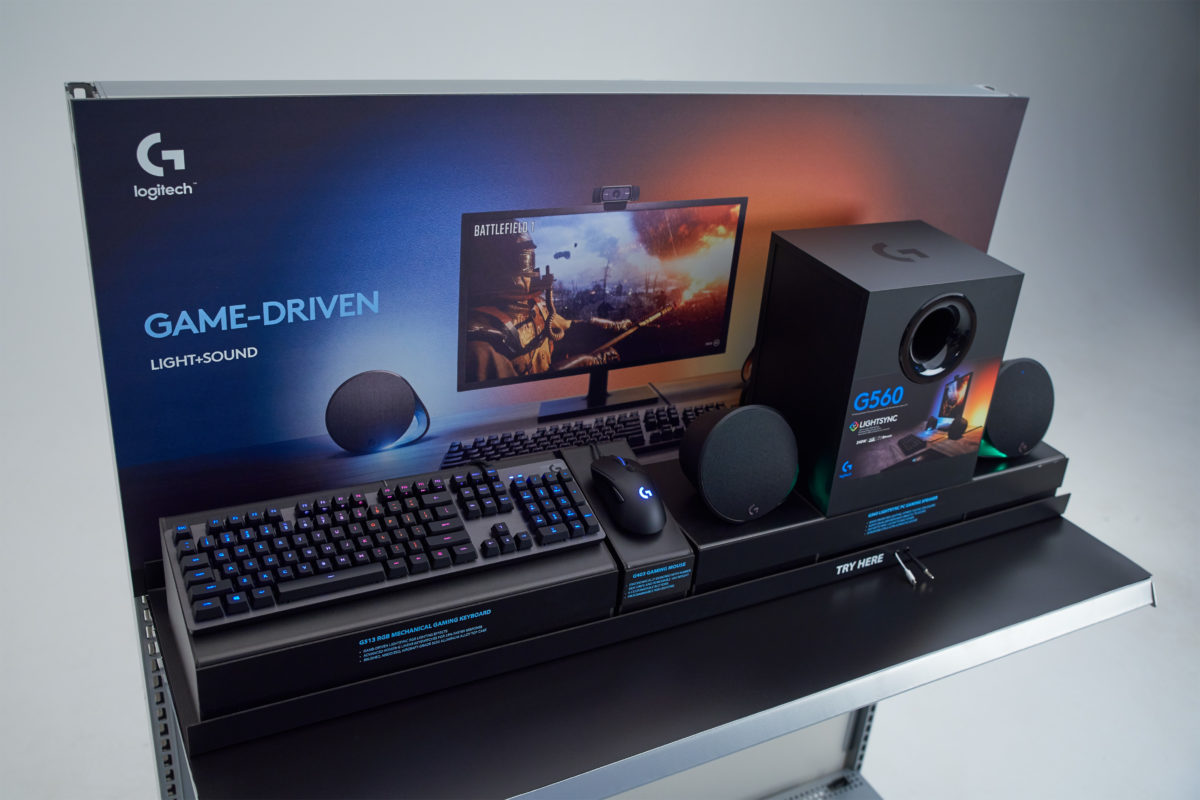 Design and fabricate a cost-effective display that promotes the featured Logitech Gaming line of products. Add interactivity to showcase the audio quality of the speaker and the LED color options of the mice and keyboard. Must be produced in a short time frame and shipped in a compact carton.